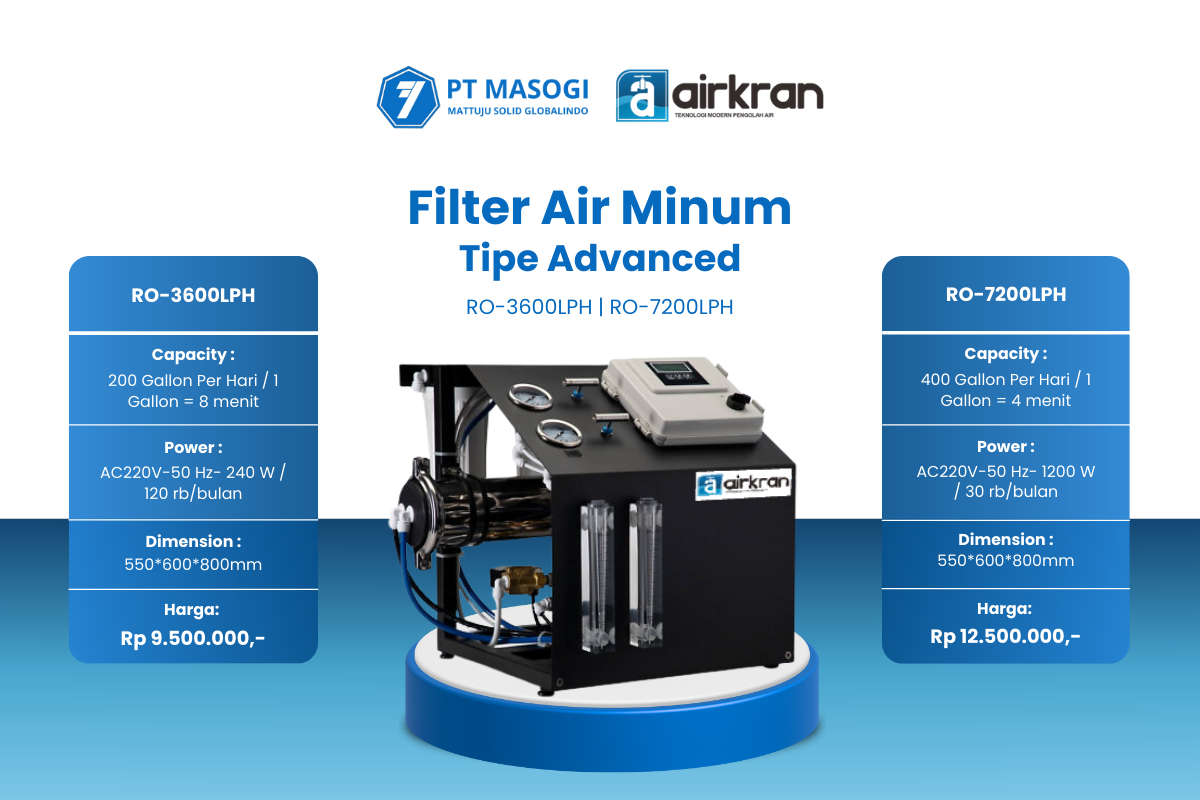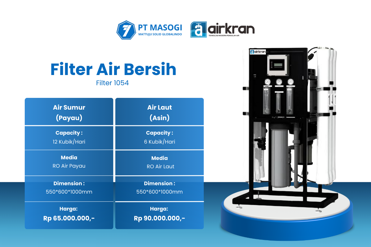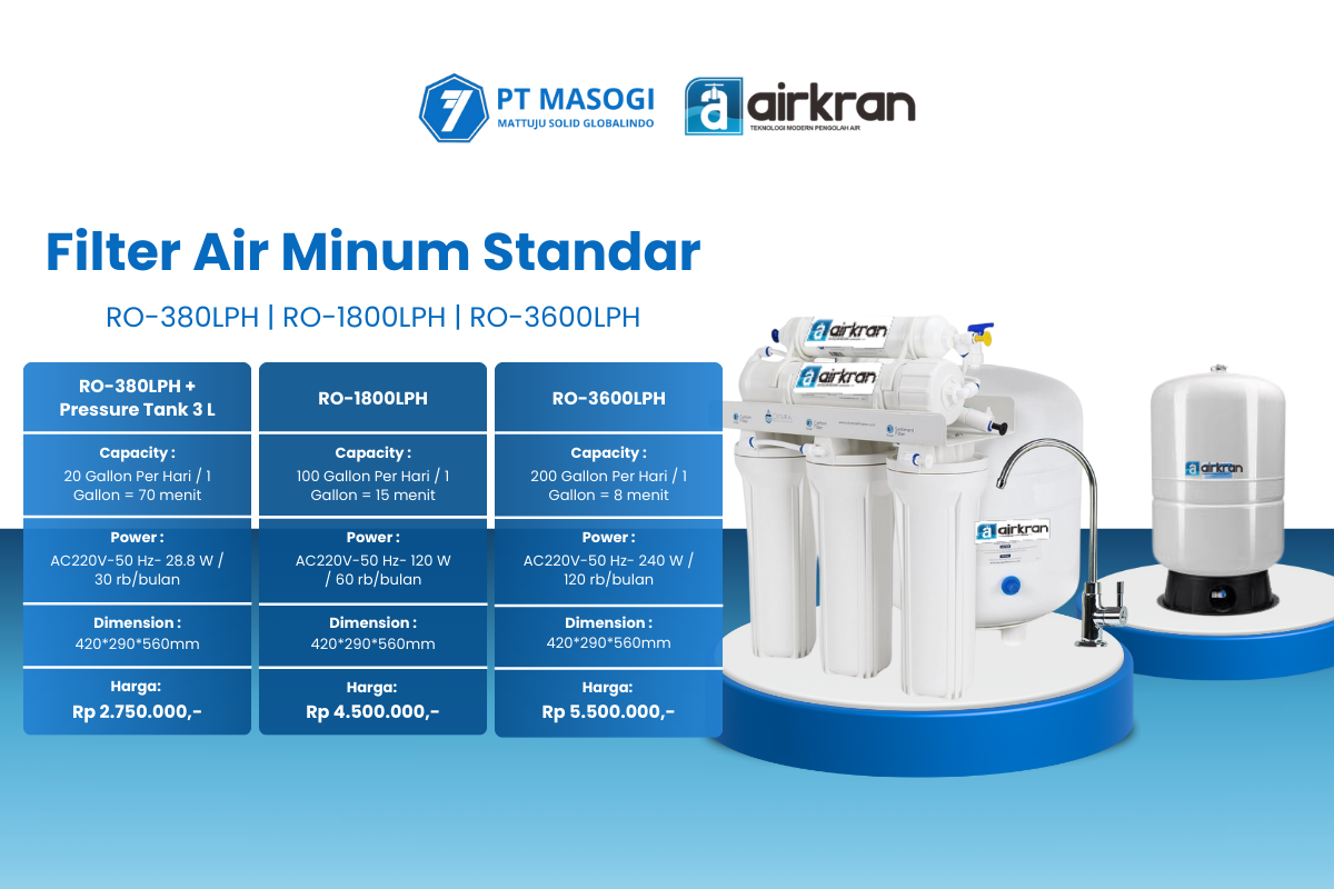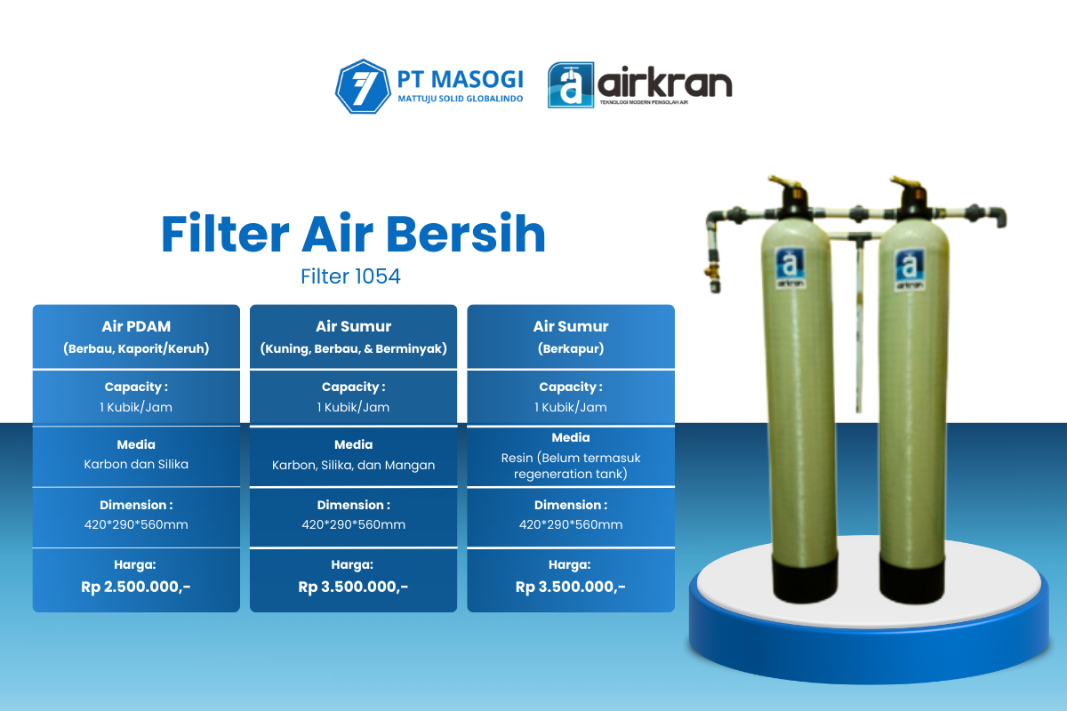 Berikut rekomendasi filter Airkran PT Masogi berdasarkan kapasitas kebutuhan air liter per hari (LPH) dan kualitas air rumah Anda: